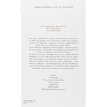 Cette anthologie est vraiment unique! Il n'y a pas un seul poète allemand qui n'y soit pas représenté, et ce depuis le Moyen-Age jusqu'à nos jours. Les notes et les notices biographiques sont excellentes, et la perfection matérielle des livres de la Pléiade n'a pas besoin d'être soulignée...Recommandé à tout lecteur un tant soit peu intéressé à la poésie allemande.